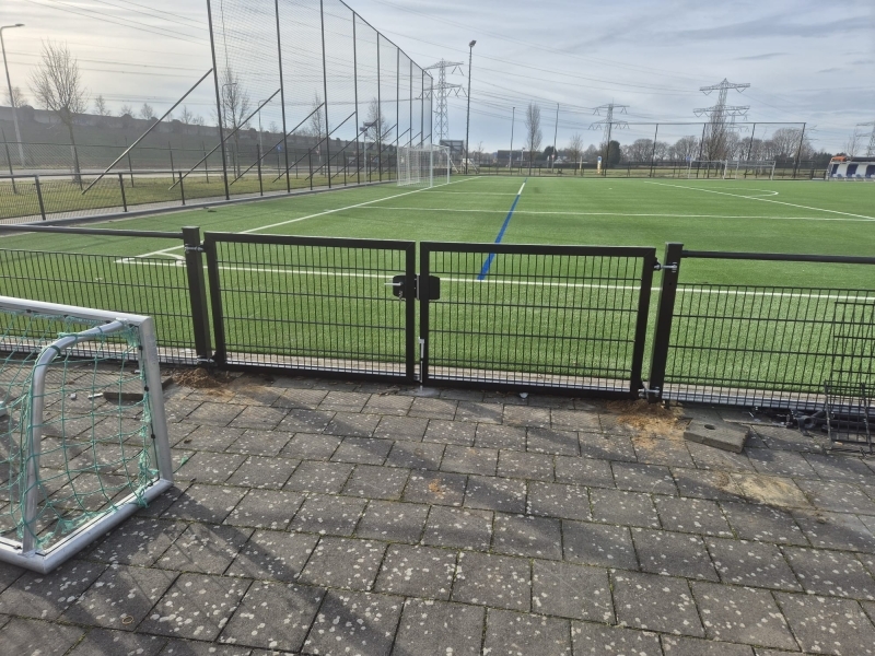 De poorten mogen deze week nog niet gebruikt worden, omdat het beton eerst een week moet uitharden. Daarna kunnen ze gewoon gebruikt worden en hoeven de doelen niet meer over de omheining getild te worden.