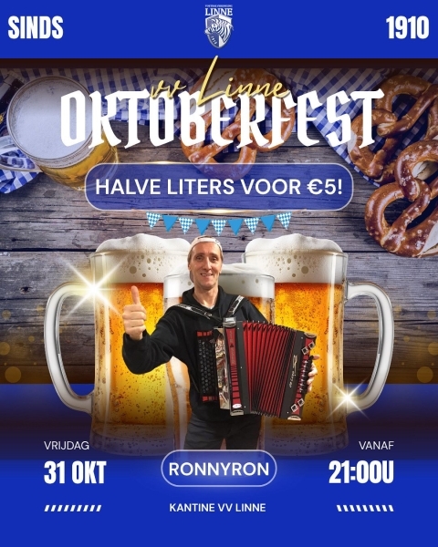 Op vrijdag 31 oktober wordt de kantine van VV Linne omgetoverd tot een ware Oktoberfest-tent vol bier, gezelligheid en Duitse sfeer!